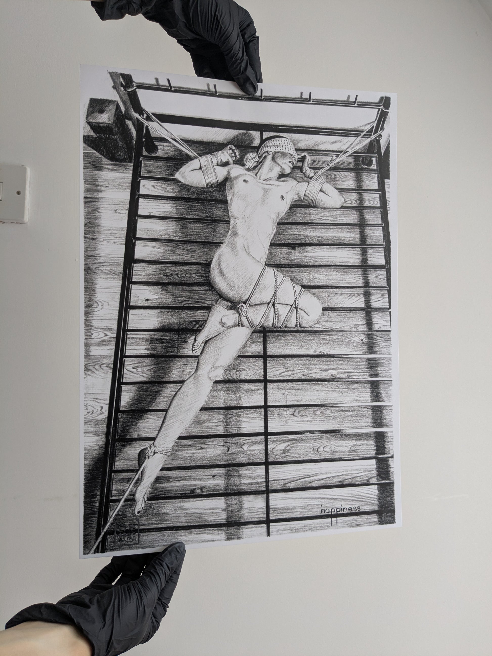 A3 art print of the work 'Tied on a bedframe' by Nappiness. 250gsm silk print.